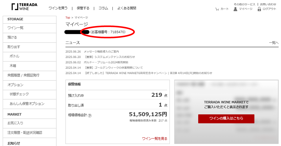 ワインのお預け入れ時に必要となるお客様番号の確認方法です。